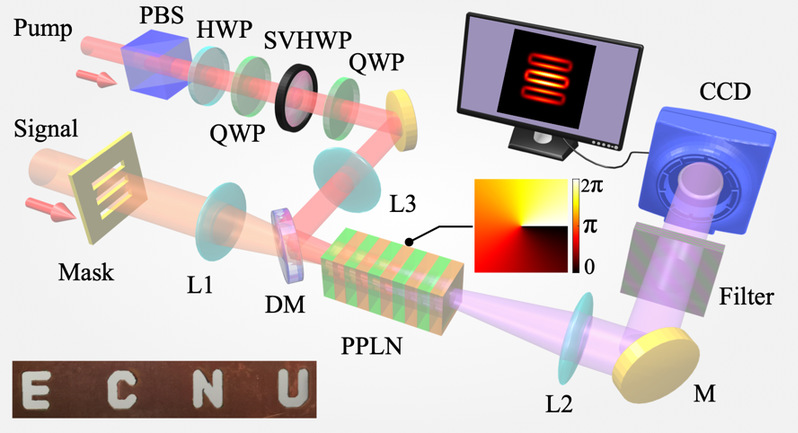 華東師范大學(xué)精密光譜科學(xué)與技術(shù)國(guó)家重點(diǎn)實(shí)驗(yàn)室曾和平教授、黃坤研究員及合作者基于中紅外非線(xiàn)性頻率上轉(zhuǎn)換成像系統(tǒng),首次實(shí)現(xiàn)了超靈敏的中紅外邊緣增強(qiáng)成像,其有機(jī)結(jié)合了螺旋相襯技術(shù)與頻率上轉(zhuǎn)換成像技術(shù),將紅外光場(chǎng)相干轉(zhuǎn)換至可見(jiàn)光波段,并通過(guò)時(shí)頻域精密控制的同步脈沖泵浦技術(shù),顯著提高了轉(zhuǎn)換效率,降低了背景噪聲。實(shí)驗(yàn)中,該團(tuán)隊(duì)利用高靈敏硅基電子倍增CCD (EMCCD)相機(jī),在0.5光子/脈沖的極低照度下實(shí)現(xiàn)了單光子水平的中紅外二維成像。進(jìn)一步地,通過(guò)在非線(xiàn)性混頻過(guò)程中引入攜帶渦旋相位的泵浦光場(chǎng),可以將螺旋相位高保真加載到中紅外傅里葉空間頻譜成分上,從而實(shí)現(xiàn)超靈敏中紅外邊緣增強(qiáng)成像。