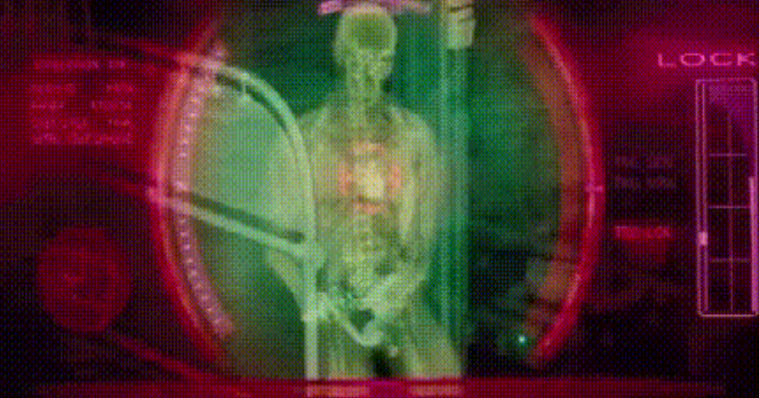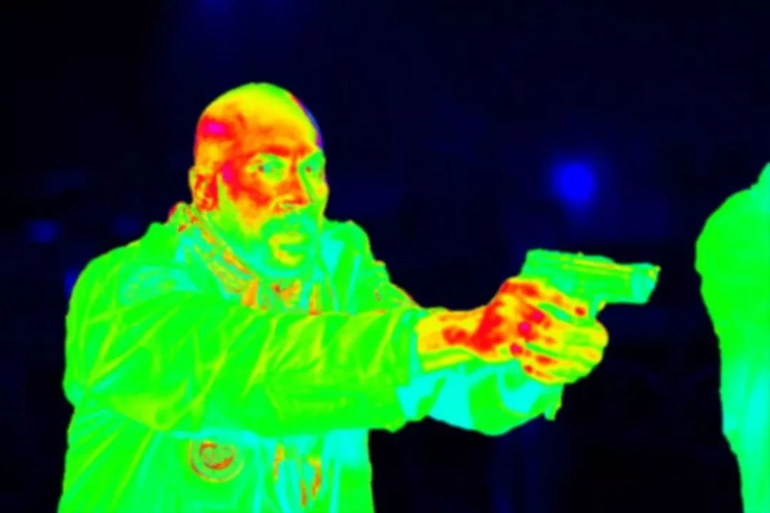 反派手握重型武器懟他進(jìn)行掃射的時(shí)候,出現(xiàn)了很多透視的鏡頭。但其實(shí)這里運(yùn)用的并不是純粹的紅外熱像技術(shù),因?yàn)榧t外熱像不可能把人透視到如電影鏡頭中出現(xiàn)的這樣骨頭分明,這更像是紅外和多種技術(shù)融合之后的效果。