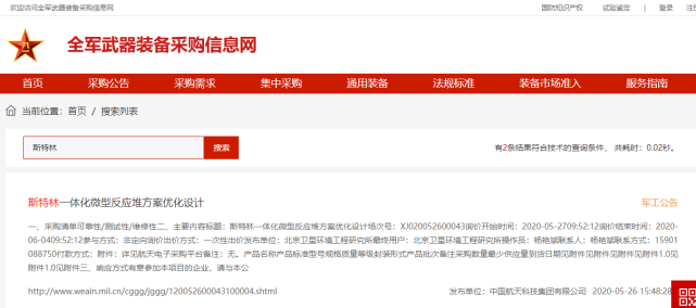 在解放軍的公示網(wǎng)站“全軍武器裝備采購信息網(wǎng)”上,最新刊發(fā)了一則消息:中國航天科技集團(tuán),正在推進(jìn)一個(gè)名為“斯特林一體化微型反應(yīng)堆方案優(yōu)化設(shè)計(jì)”的項(xiàng)目。