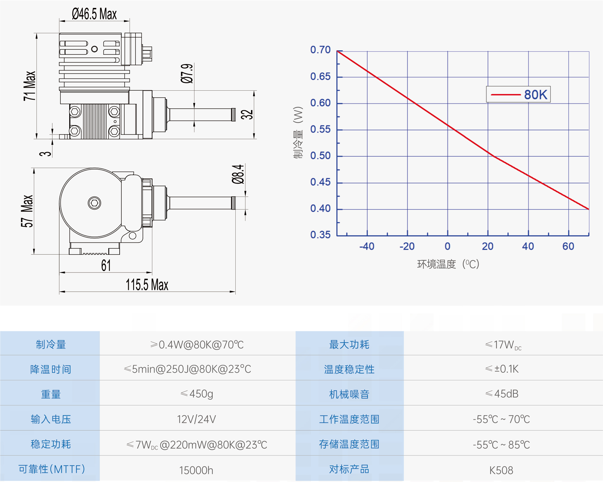H108集成整體式制冷機(jī)是按照集成式杜瓦/制冷組件(IDCA)概念設(shè)計,控制器集成于制冷機(jī)電機(jī)內(nèi)部。具有機(jī)械振動小、噪音低和15000小時以上的高可靠性等特點。已實現(xiàn)年批量500套的生產(chǎn)能力,可用于地面、機(jī)載等多種系統(tǒng),是中等規(guī)模焦平面探測器組件的優(yōu)選制冷機(jī)。